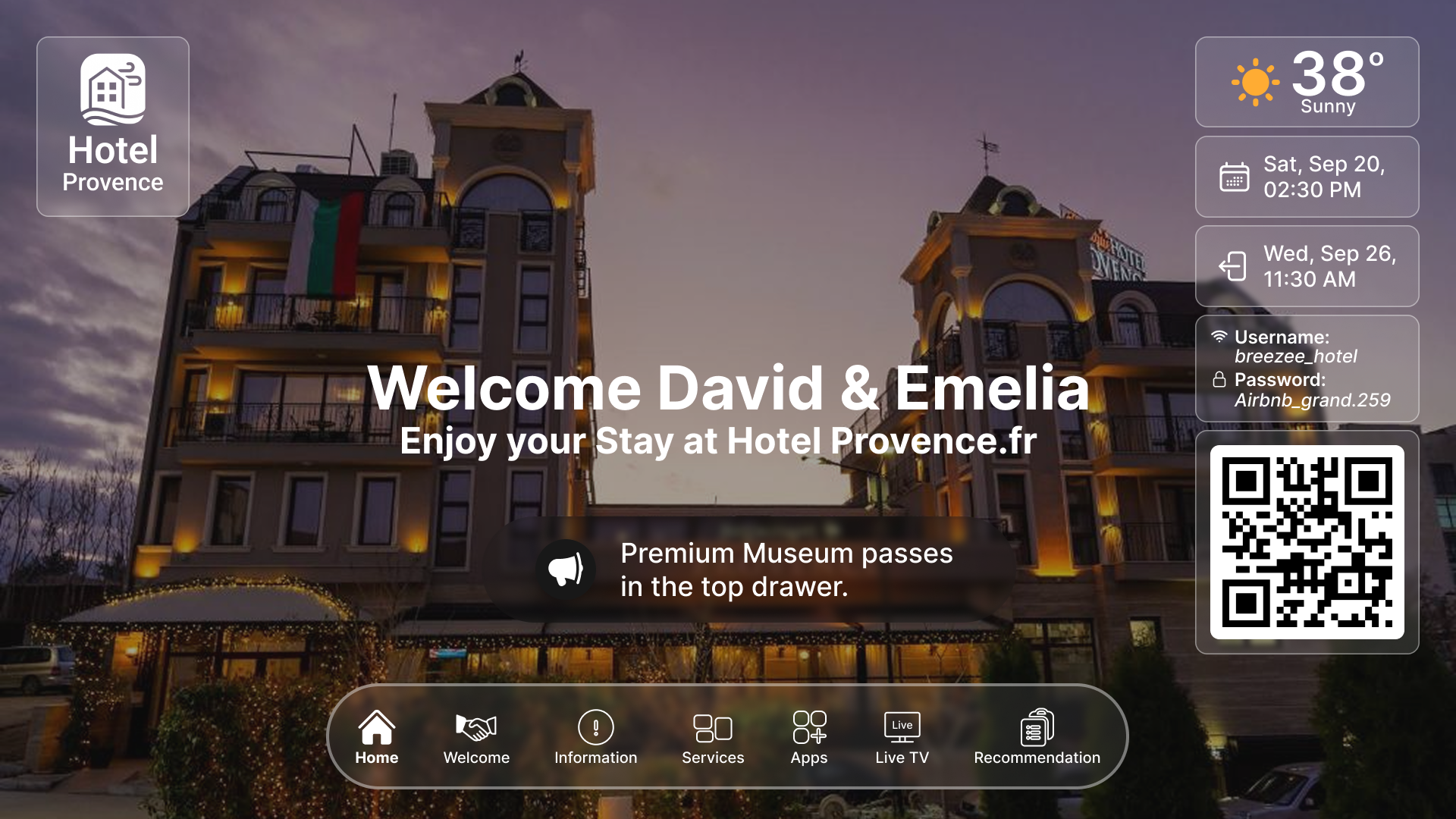 Greet each guest with personalized messages, hotel branding, and important information about their stay upon turning on the TV.